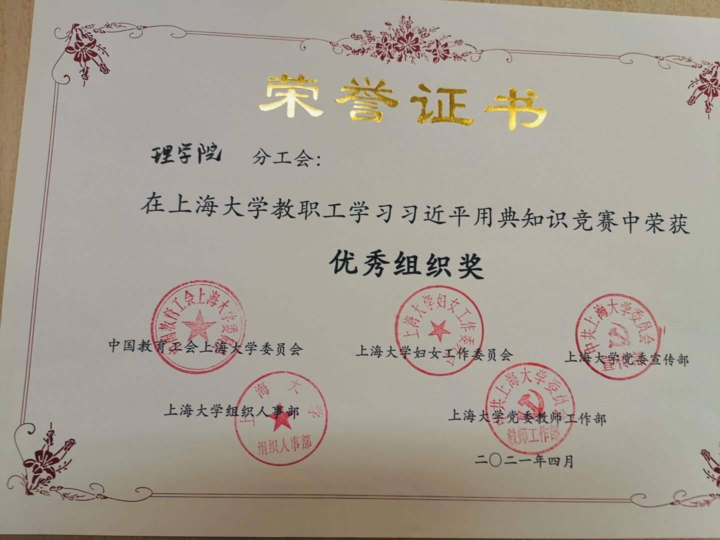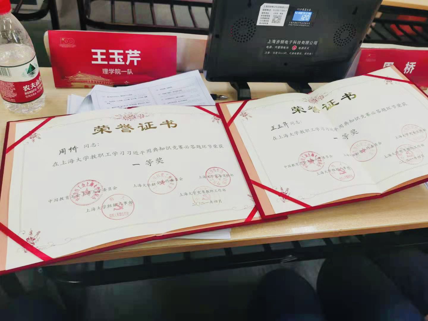 习近平总书记在重要讲话文章中常常引经据典,寓意深邃。为促进广大教职工学经典、用经典,感悟经典中蕴含的思想精髓,上海大学工会联合相关部门举办“赛经典名句 促党史学习 庆百年党建”为主题的上海大学教职工学习习近平用典知识竞赛。理学院教工代表王玉芹、周桥、王玉彪、李晨阳积极参赛,在竞赛中增强党员的意识,提升党性修养。理学院一队在竞赛中荣获必答题环节一等奖、抢答题环节二等奖,理学院分工会荣获优秀组织奖。