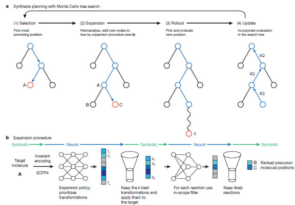 传统的化学合成路线设计一般采用被称为"逆合成分析"的策略,把要合成的复杂目标分子拆分成若干小分子前体,对前体再拆分,不断进行,直到达到实验室已有的化合物为止。Mark Waller教授应用计算机来辅助逆合成分析,开发了新的计算预测系统。该系统采用蒙特卡洛树进行搜索,并引入符号人工智能来寻找逆合成分析的路线。并且,在蒙特卡洛树步骤还中引入了两种深度神经网络来提高计算精度与效率:扩张决策网络用于寻找路径,过滤网络用于对可能的逆合成路线进行初步筛选。用于训练神经网络的测试集包括了所有已经发表过的有机化学反应。经测试,Mark Waller教授开发出的分析系统比传统的计算机辅助法快30倍,预测出的合成路线比传统计算机辅助法给出的多一倍,还不需要任何其他的经验或者假设。Mark Waller教授开发的逆合成分析系统的结果具有很高的专业水平,在一个双盲的AB测试中,大部分接受测试的化学家都认为,分析系统生成的合成路线是与已经发表的文献等价的。