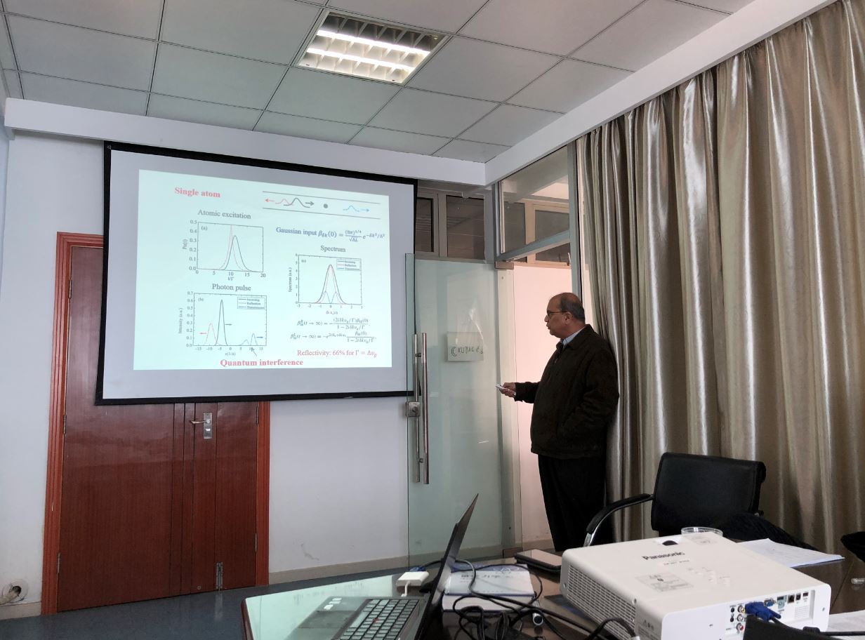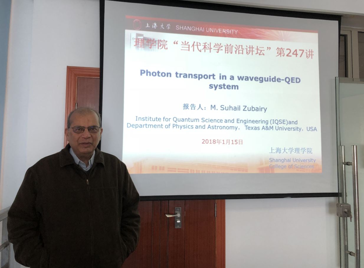 2018年1月15日上午,应理学院物理系李征鸿博士的邀请,美国德州农工大学物理与天文系教授M.Suhail Zubairy在校本部G401作了题为"在波导-QED系统中的光子传输"的学术报告,该报告是理学院"当代科学前沿讲坛"第247讲。报告会由物理系李征鸿博士主持。理学院副院长陈玺教授、物理系副主任任伟教授、李春芳教授、杨希华教授、张永平教授等物理系30多名师生参加了本次学术报告。
