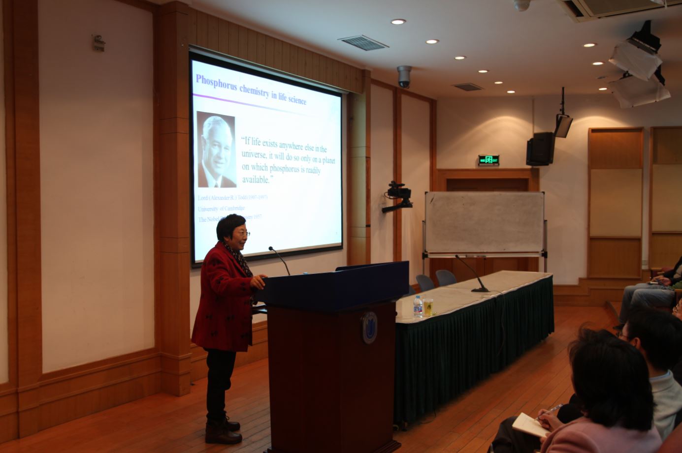 赵院士还在J201为上大师生做了题为"磷与生命起源"的学术报告。本次报告是理学院"当代前沿讲坛"第245讲、化学系"今日化学"第203讲。报告由陈雅丽教授主持。赵院士阐述了磷和生命起源的内在关系。她介绍"磷酰化氨基酸是蛋白质和核酸的共同起源"著名理论提出的背景,特别是磷和氨基酸结合得到的磷酰化氨基酸是生命进化的最小系统,可以与氨基酸结合形成肽,还可以与核苷作用成为核苷酸等,并由此得出磷是生命化学过程调控中心的结论。在进一步阐述生命起源的过程时,赵院士还列举了剧毒的5分子的HCN气体发生反应生成1分子腺嘌呤,从而推测在恶劣的远古地球环境下有可能经过这样的反应却生成了三磷酸腺苷的腺嘌呤,进一步诱导产生了最早的蛋白质ATP结合蛋白。通过本次讲座,广大师生深入了解了生命起源和磷化学的关系,领略了院士严谨的科研态度、睿智的大师风范。