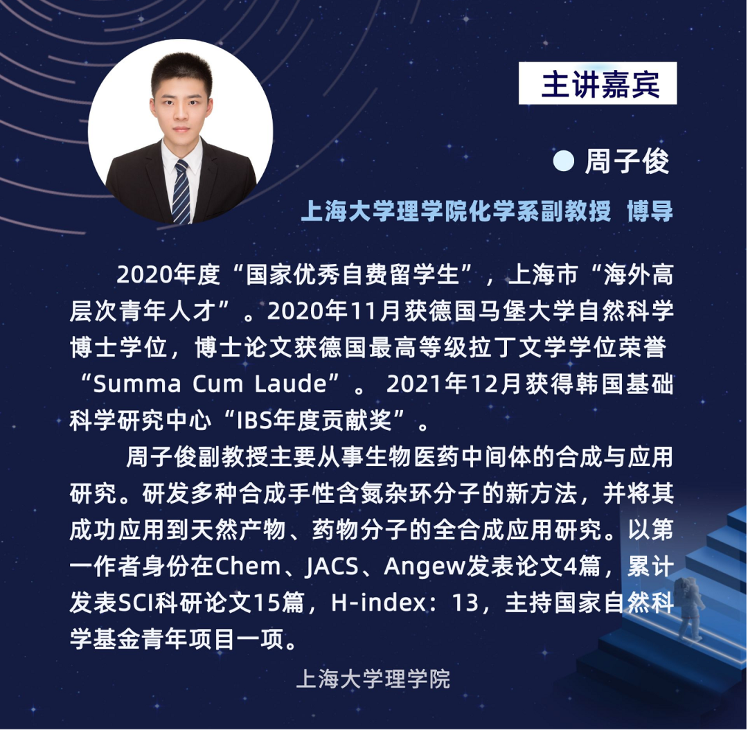 为拓宽学术视野,锻炼科研精神,提高学生的科研能力,10月19日晚上七点半,在理学院党委的指导下,遵守疫情防控措施,理学院在线上腾讯会议以及嘉定校区2教201举办理学院青教讲堂暨标杆讲座系列“寻找科研与生活的契合点”。理学院副教授周子俊主讲题为“我的学生时代:寻找科研与生活的契合点”的专题讲座。本次活动出席的嘉宾老师2022级研究生辅导员老师魏宛辰。本次讲座由理学院化学系研究生薛雅宁主持。百余名理学院研究生参加了本次线上讲座。